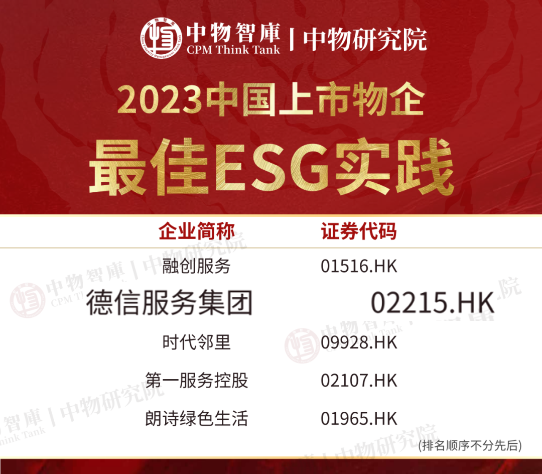 5月10日,中物智库、中物研究院重磅发布《2023中国物业管理行业上市物企测评研究报告》。德信服务,凭借知己特色的温情服务与稳健的企业运营成绩备受认可,成功入选“中国上市物企企业稳健经营TOP5”。 同时,凭借在碳中和领域与可持续发展领域的持续深耕,德信服务本次成功获评“中国上市物企最佳ESG实践”。